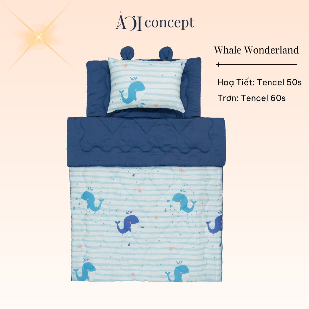 Bộ chăn gối nệm cho bé ( Mền lớn) Tencel 60s, Họa tiết Tencel 50s [ Whale Wonderland ]
